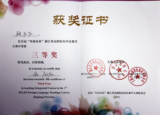 11月9日,首届“外教社杯”浙江省高职院校外语教学大赛决赛在杭州举行。全省近50所高职院校老师参加了该赛事,经过激烈的初赛、复赛角逐,有15位老师最终进入决赛。我院教师顾飞飞在决赛中荣获三等奖。