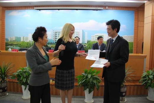 最后,Rhonda 女士代表霍姆斯格兰学院向我校颁发海外教学优秀成果奖和优秀管理奖2项证书,副校长徐永春代表我校接受了证书。