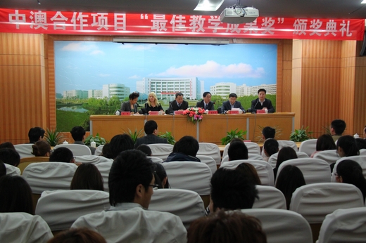 3月22日下午,霍姆斯格兰学院海外部经理Rhonda女士一行2人专程代表霍姆斯格兰学院来我校颁发最佳海外教学成果奖和优秀管理奖。这是霍姆斯格兰学院在海外10多个国家的合作办学项目中第一次颁发这样的奖项。我校党委书记蔡泽伟、校长谢一风、纪委书记李振祥、副校长徐永春等校领导以及中澳合作项目的师生出席了颁奖典礼。省教育厅外事处调研员吴伯刚,宁波市教育局国际交流与合作处处长汪维民作为特邀嘉宾出席本次活动。活动由谢一风主持。