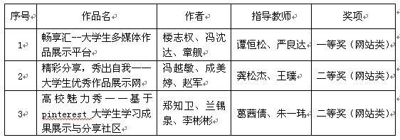 2013年11月17日,第十二届浙江省大学生多媒体作品设计竞赛决赛在杭州电子科技大学举行,我院组队参加了网站类作品设计比赛。此次大赛在高职组共评出网站类比赛一等奖4个、二等奖7个,我院参赛选手经过精心准备、努力拼搏,在网站比赛中获得1个一等奖、2个二等奖的好成绩。具体获奖情况如下: