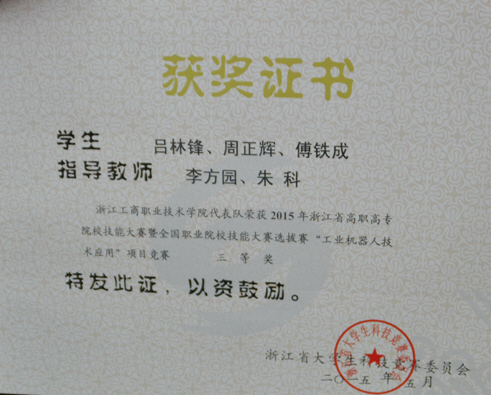 近日, 2015年浙江省职业院校技能大赛暨全国职业院校技能大赛选拔赛“工业机器人技术应用”赛项比赛在浙江纺织服装职业技术学院举行。来自杭州、湖州、金华等地6所高校的12支代表队参加比赛。经过一天的激烈角逐,有电气自动化专业吕林锋、周正辉和机电一体化傅铁成组成的浙江工商职业技术学院一队获得三等奖。