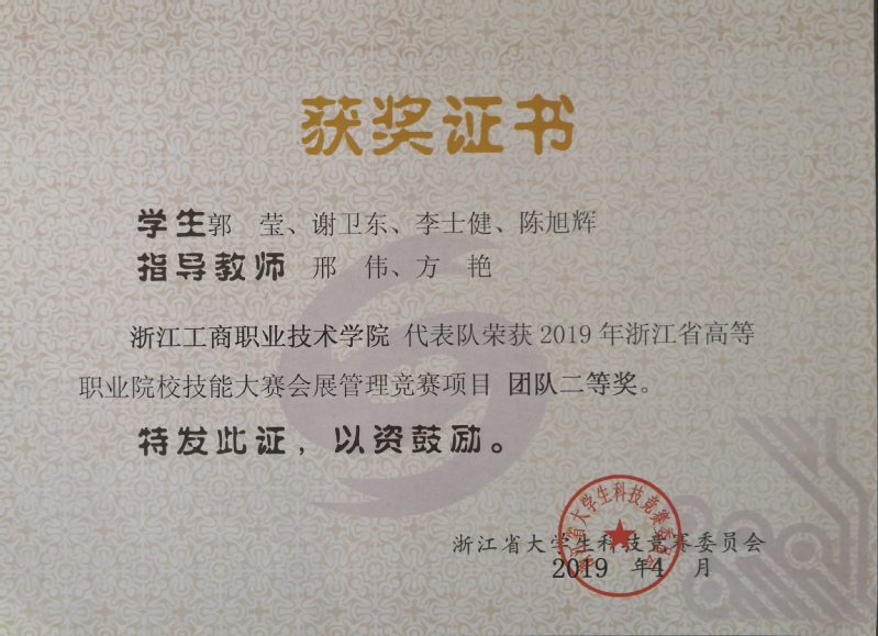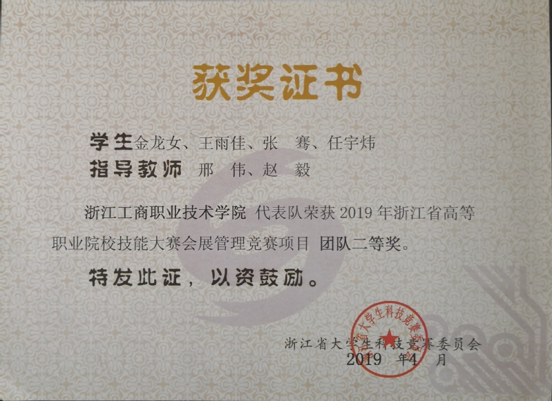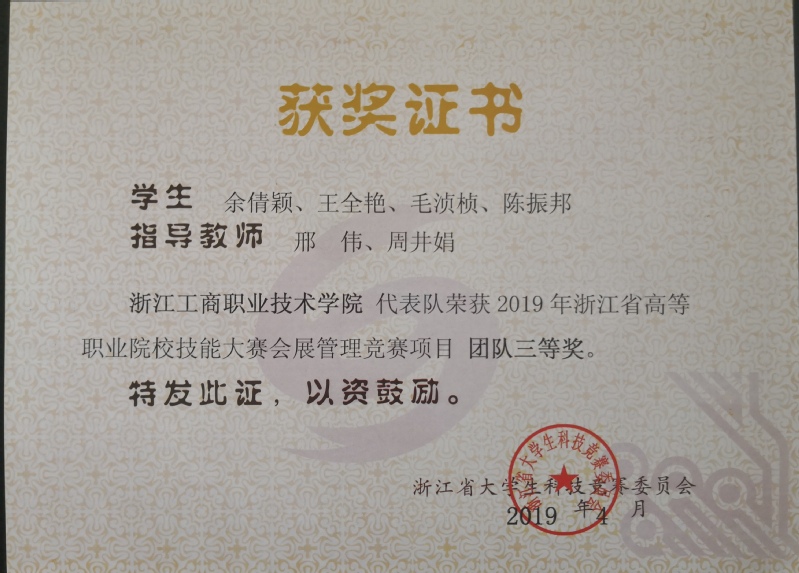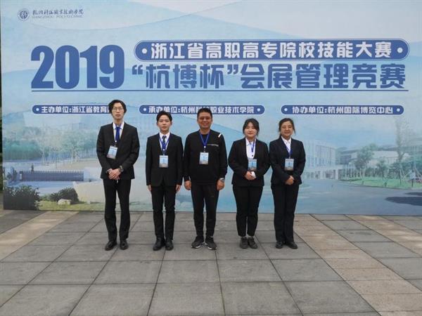 2019年4月27日,2019浙江省高职高专院校职业技能大赛“杭博杯”会展管理竞赛在杭州科技职业技术学院圆满落幕。我校市场营销、广告设计、电子商务等专业的12名学生组成的三支代表队,在经管学院邢伟、周井娟、赵毅和数字传媒学院方艳老师的指导下,跨学院、跨专业组建参赛团队,在学校没有会展管理专业的情况下,与来自全省18所高校的48支代表队同场竞技,脱颖而出,三支代表队荣获两个二等奖和一个三等奖。