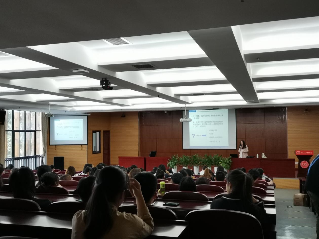 2020年10月14日下午在能容纳200余人的中和楼217报告厅,会计专业主任乐敏老师为会计专业新生的7个班级进行了两场专业始业教育讲座。讲座内容包括三个方面:本专业的基本情况包括招生就业及师资情况,会计行业对人才的要求及本专业的课程体系框架,毕业条件及学习生活建议等。