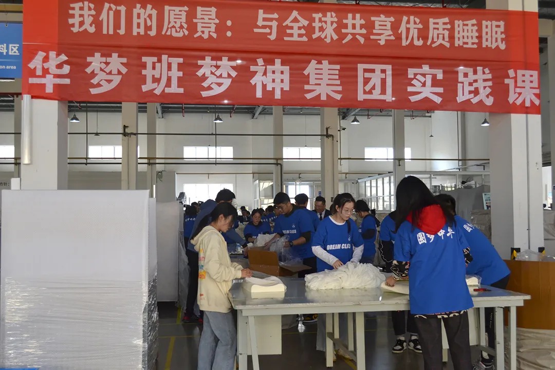 生产主任许经理带领同学们参观了生产基地。通过深入梦神五大车间,同学们近距离了解到一张床垫的制造过程,感受现代化生产工艺,加深对床垫“背后故事”的认知。参观期间,同学们结合所学理论知识,向梦神讲解员提出疑问,并得到了一一解答,真正使理论与实践结合。