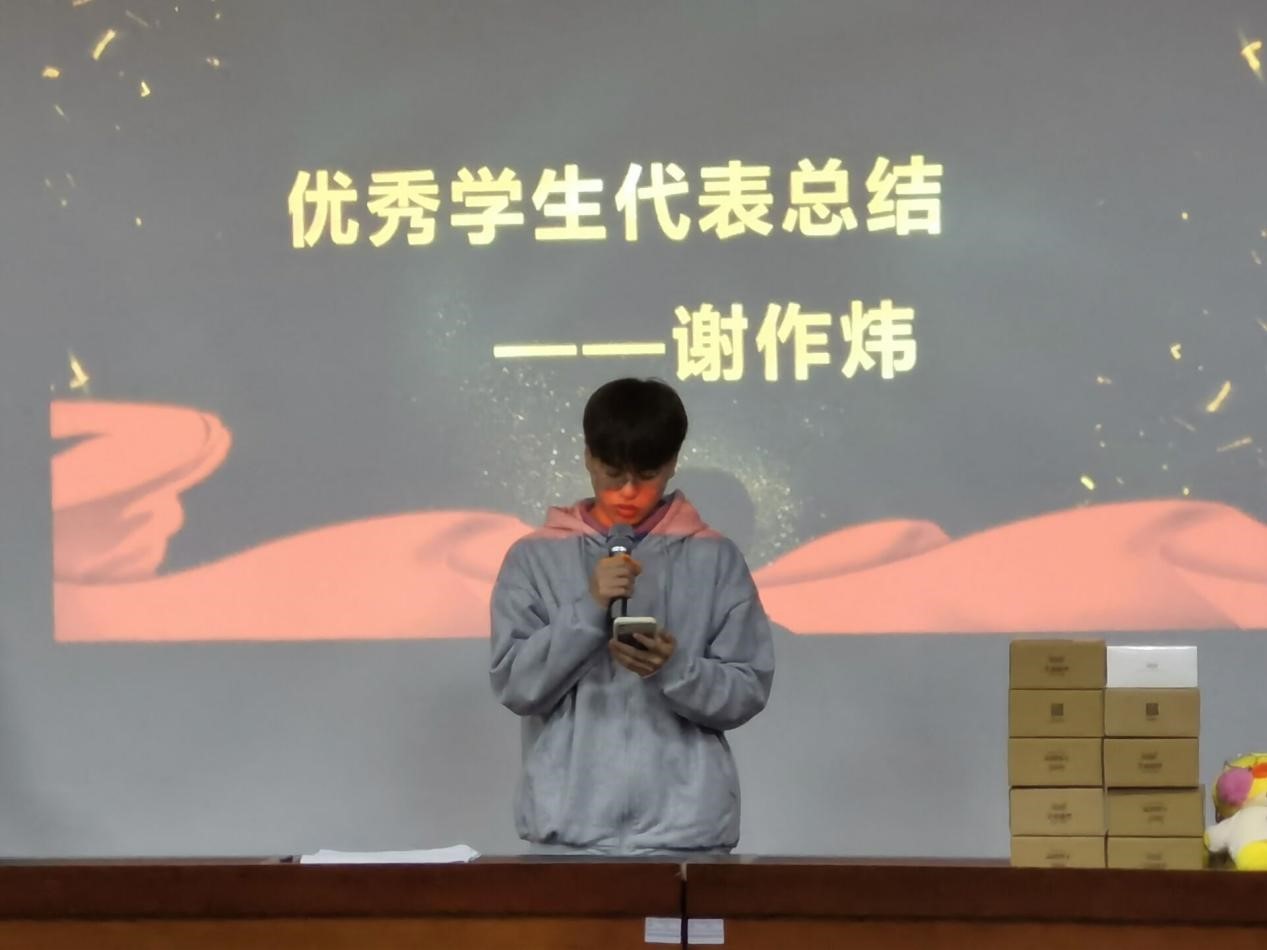 紧接着由优秀学生代表营销1813班谢作炜同学进行获奖感言,从他的介绍中,可以了解到作为一名合格的客服人员需要具备良好的心态,忍耐力以及一颗宽容的心,在进行团队活动中,要认识到团队精神的重要性。