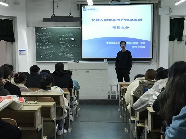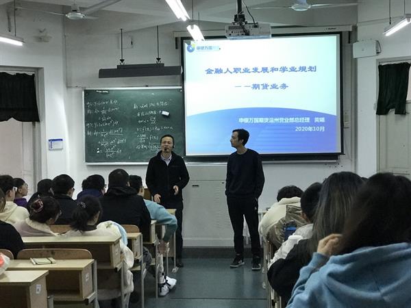 11月27日下午,2006届优秀毕业生、申银万国期货温州营业部总经理黄曦参与了《期货与期货交易》课程教学。黄总以金融人职业发展和学业规划为主题,从“期货是什么、期货公司组织架构、期货行业对人才的要求”三个方面阐述了自己的观点。他详细介绍了期货是什么、期货公司组织架构和业务,并结合自身经历,通过真实案例给同学上了精彩一课。他认为,作为期货人应具备基本素质、为人正直、有责任感、行业使命感和开拓创新精神。最后,对学弟学妹提出了忠告:大学生出来就业不能眼高手低,期货行业不单只有投资经理一条路,期货公司的每一个岗位都有实现价值的意义。前提我们要把每个岗位职责尽到、任务完成。公司需要既有专业能力又有行业使命的同学加入。