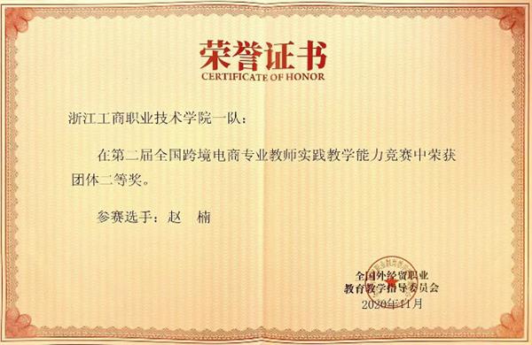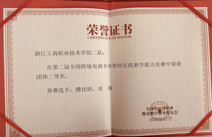 近日,由全国外经贸职业教育教学指导委员会主办的第二届全国跨境电商专业教师实践教学能力竞赛落下帷幕。本次大赛共有来自全国22个省份的212所本科、专科高校,共计430支参赛队、790位老师同台竞技。经过激烈角逐,国际商务(中澳合作)专业濮佳妍、章翰老师团队和赵楠老师团队双双获得团队二等奖的好成绩。