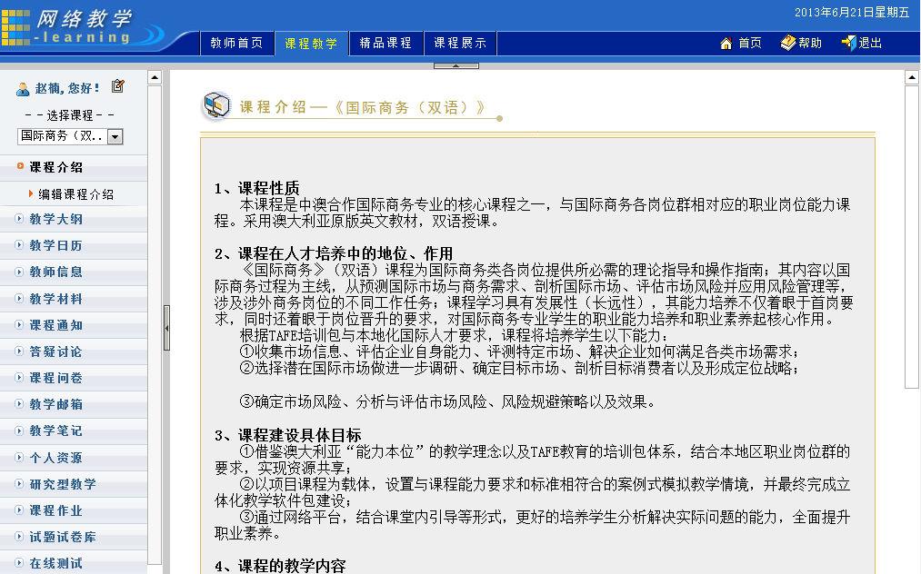 为推动在线课程建设,提升线上课程建设成效,中澳(国际商务)专业积极响应并参与2020年校级精品在线开放课程立项申报工作,共申报四名课程,均为双语课,包括《Promote Products and Services in International Markets(双语)》、《商务沟通(双语)》、《Team Effectiveness(双语)》、《国际商务(双语)》。其中,自2012年起,《国际商务(双语)》课程就利用学校网络平台和相关教学软件,开设起了网络课程。