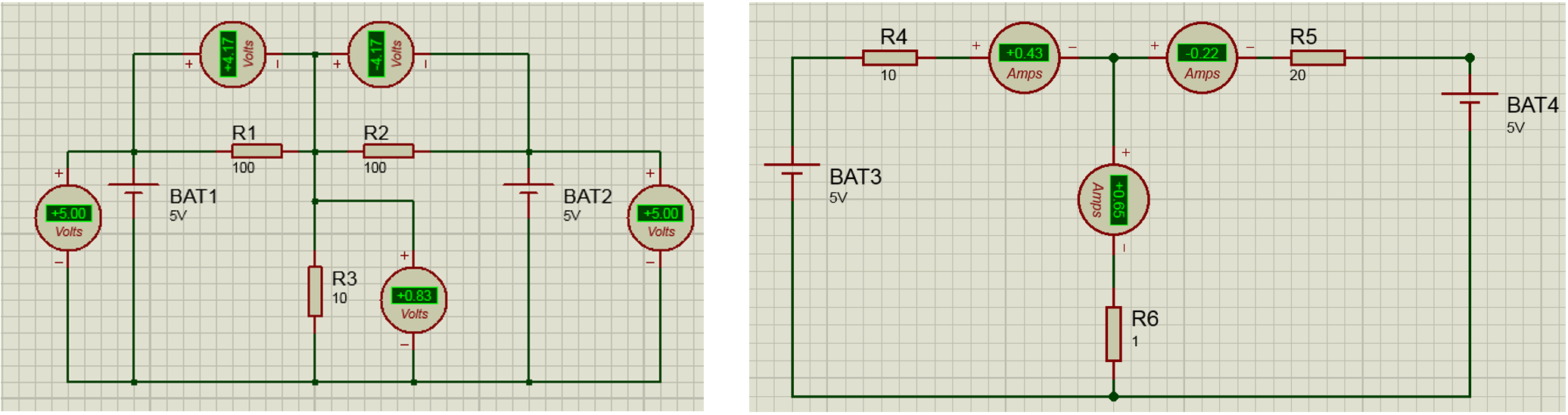 在讲解具体定律时要学生进行计算,学生算完后如何直观地展示是一个难题,因为没有黑板,也不能面对面进行教学,所以采用proteus仿真软件直观地展示内部电路情况,图2是在讲解基尔霍夫电压定律和基尔霍夫电流定律时,用软件展示每一个元件上的电压,每一条支路的电流,学生可以直观地看到自已哪里没算对,也可以检验教师是否计算正确。