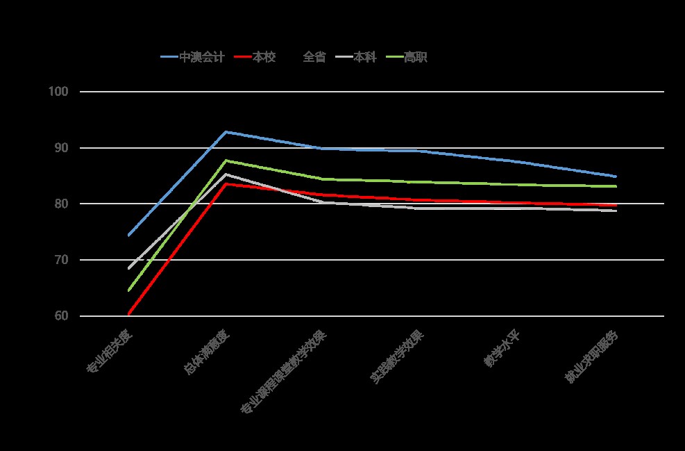 指标共分为就业率、就业质量、职业胜任度及创业前景、对母校满意度五个维度,共计12余项指标。总体而言,各项指标基本优于省、校平均水平。在升学率、离职率、专业相关度以及对母校满意等指标方面全校排名优异。其中专业升学率毕业三年后分别位列全校第3,1,1位,毕业一年后均位于全校第1位,体现出学生多元化发展。对母校满意度各项指标均位于全校前列,反映出专业近年来积极开展本土化会计元素融入、开设实践教学的良好效果。但在创业率、工资水平等方面还有进一步提升的空间,这也将促进专业进一步提升教学质量的动力所在。