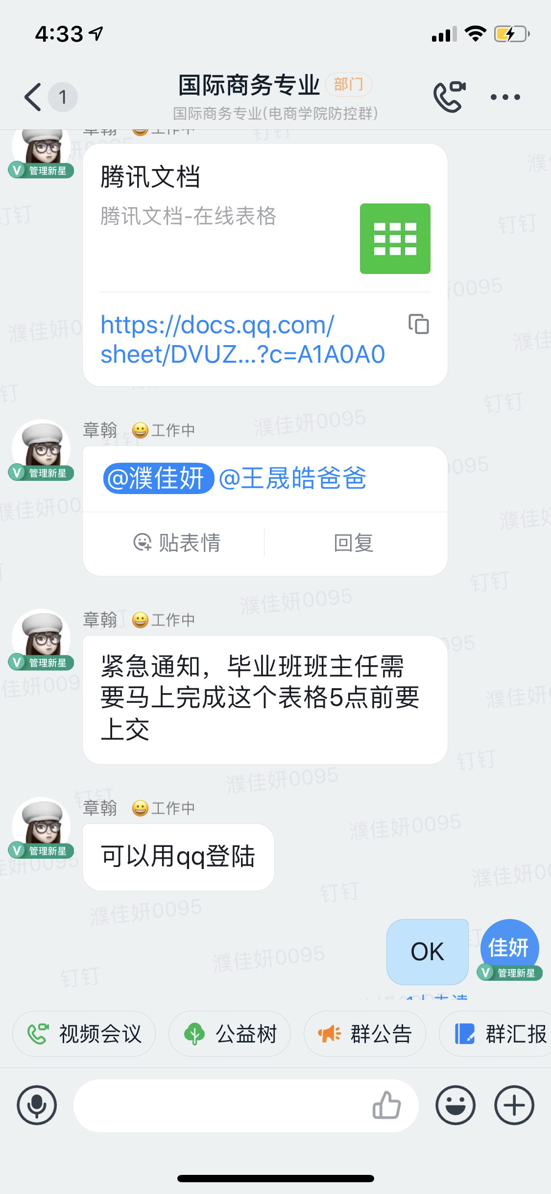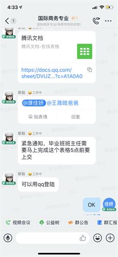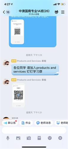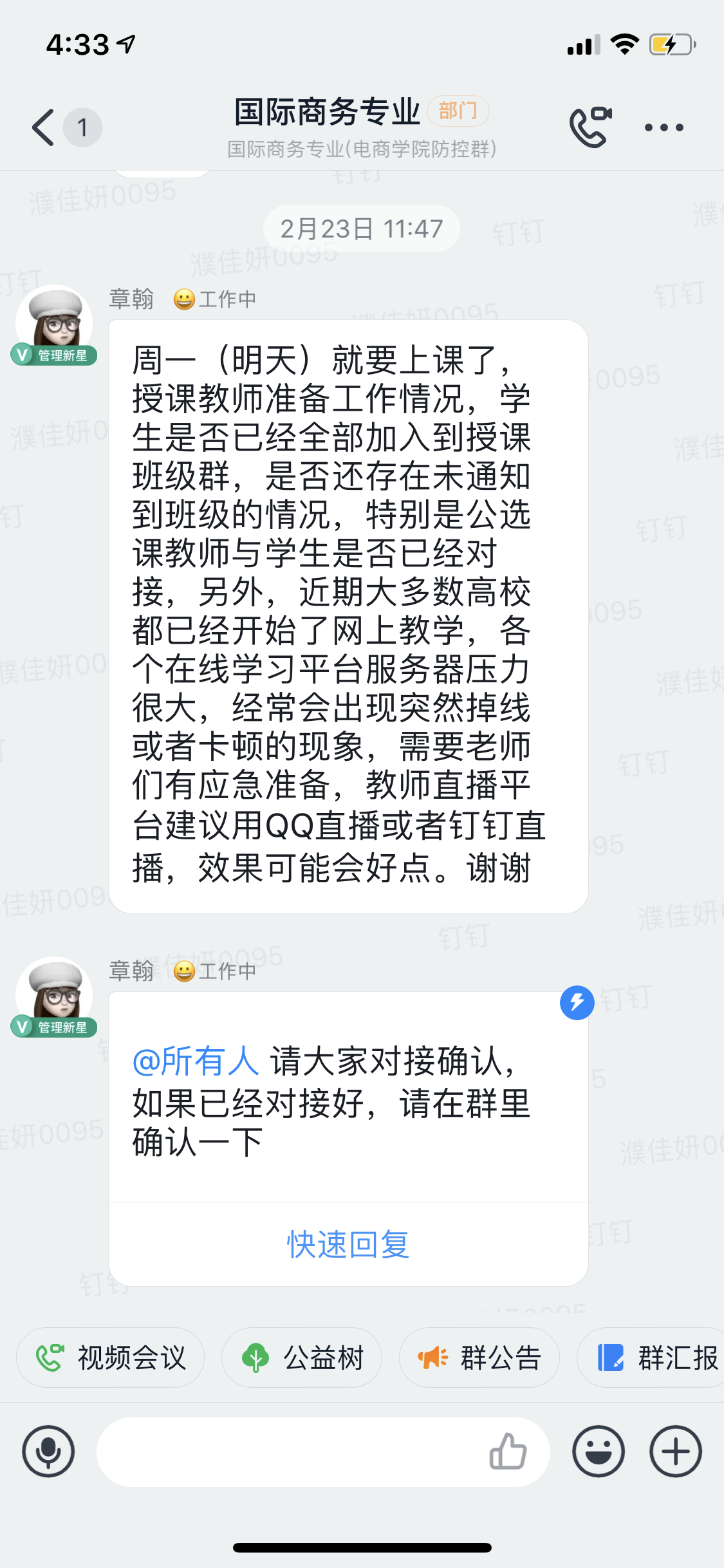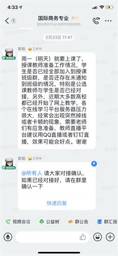 同时,鉴于近期各个在线学习平台服务器压力大,经常出现突然掉线或者卡顿的现象,国际商务(中澳合作)教师们都准备了应急预案。朱正浩老师对所授课程进行了提前录播,章翰、熊庆云、赵楠、濮佳妍老师在钉钉平台上又建立了一个班级群,王建成老师准备了腾讯课堂应用软件,以确保在线教学的顺利开展。
