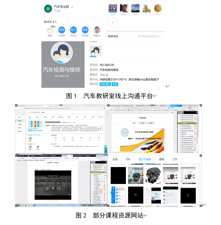 我校响应教育部“停课不停学”的号召,出台了《印发关于疫情防控期间在线教学组织与实施方案的通知》[浙工商教〔2020〕20号]文件,电子信息学院从2月12日开始部署在线教学工作,制定相关实施方案、操作流程和工作分工。汽车专业教研室首先梳理了线上沟通平台,在QQ群的基础上建立了钉钉群、微信群;汽车专业教研室四位教师于2月13日通过微信进行了2019-2020学年第二学期的课程研讨。根据学校以及学院网上教学的要求,结合本学期的课程性质及内容特点,从中国大学MOOC、智慧职教、超星尔雅等平台甄选了7门的课程资源,考虑到在线平台提供的课程资源与本专业实际情况不相符,同时也进行了在线课程自建准备,为顺利开学做好准备。部分课程网站如图2所示