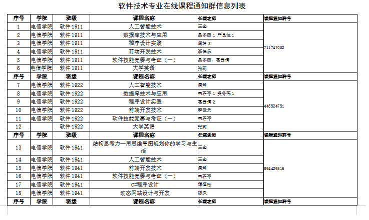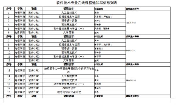 2、为开课班级提供专业在线课程通知群信息列表,以便学生能够及时的联系专业任课教师,保持信息通畅。
