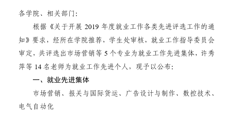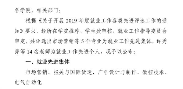 报关与国际货运专业获得学校2019年度就业先进集体荣誉称号,我专业历来高度重视就业工作,创新工作机制,就业工作被列入专业重要工作议程,教研室定期召开就业专题会议,研究部署相关工作。