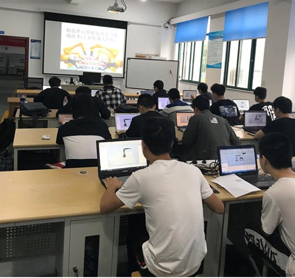 制造单元智能化改造与集成技术工业机器人控制项目于2020年5月26日下午在慈溪学院E3101举行决赛,参赛学生为慈溪学院电子信息学院电气自动化专业学生,实际参加决赛总人数是30人,决赛内容主要包括:给定机器人控制系统的搭建、坐标系的创建、编程调试等。经过裁判组综合评价,最后确定了获奖名次,获得一等奖的1人,获得二等奖的5人,获得三等奖的8人。