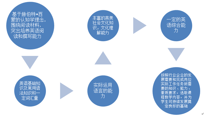 本课程秉承赫伯特西蒙的认知学理念,重点围绕阅读材料,突出培养学生英语阅读和撰写能力;引导学生扎实掌握英语基础知识及常用语法知识,具备一定的词汇量;培养实际运用语言的能力;丰富学生的英美社会文化知识,培养文化理解能力;使学生具备一定的英语综合能力;按照行业企业的发展需要和完成岗位实际工作任务所需要的知识、能力、素质要求,选取课程教学内容,并为学生可持续发展奠定良好的基础。