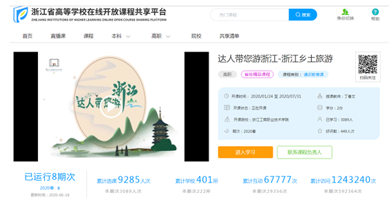 2008年,《浙江乡土旅游》作为旅游管理专业核心课开设;接着,作为公选课供全校学生学习;2013年后,先后建设为学校、宁波市、浙江省精品在线开放课程,供省内外大学生及社会学习者在线学习;目前正在参评国家精品在线开放在线课程。