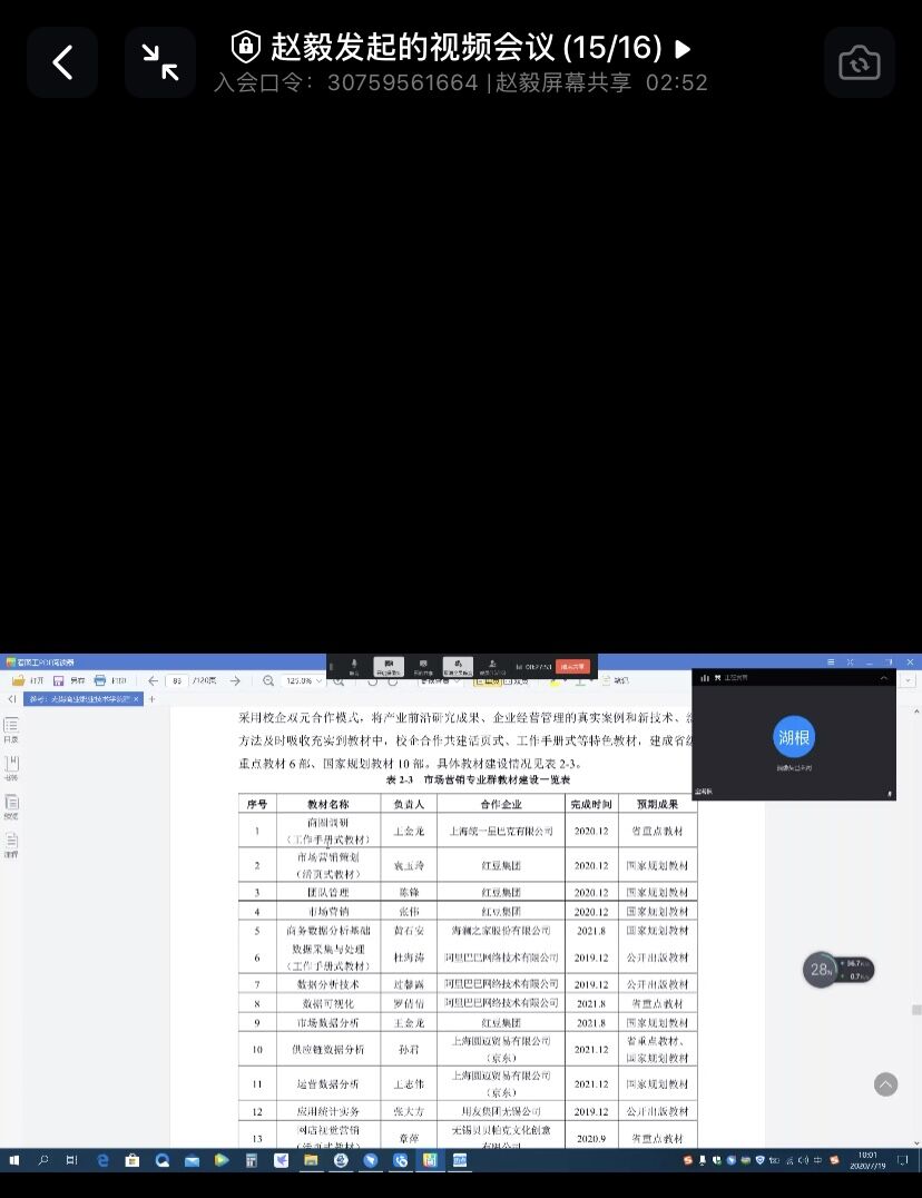 2020年7月19日,市场营销专业所有教师在暑假期间继续展开专业教学研讨活动,于周日上午9:30在钉钉上进行了专业在线视频会议。在本次专业会议上,专业教师们按分院要求研讨了文件《经济管理学院关于 2020-2021 学年第一学期“课程标准”、“授课计划”制定的原则要求》,学习了无锡商业职业技术学院的双高建设方案和我校双高建设的市场营销专业群建设规划,明确了暑期中课程建设和专业建设的各项工作要求。