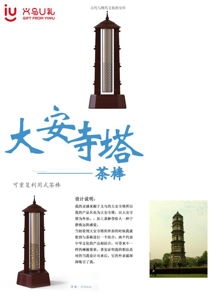 本次大赛由义乌市人民政府主办,以“义乌好礼,全球共享”为主题,从2020年1月8日开始,历时近2年。经过大赛组委会专家多轮现场评选、模型制作、入围选手答辩等环节,首届“义乌好礼”设计大赛总决赛结果正式揭晓。参赛中,钱帅同学对地域文化深度调研,选择义乌传统历史建筑—大安寺塔的造型特征,结合现代茶文化的产物茶棒,让传统文化与现代艺术交织融合,产品兼顾历史的脉络亦顺应时代发展,韵味独特。经过造型设计,结构设计,形成最终设计方案。决赛时的精彩演讲获得评委肯定,最终荣获本次大赛新锐奖,作品在中国义乌文化和旅游产品交易博览会上公开展出。