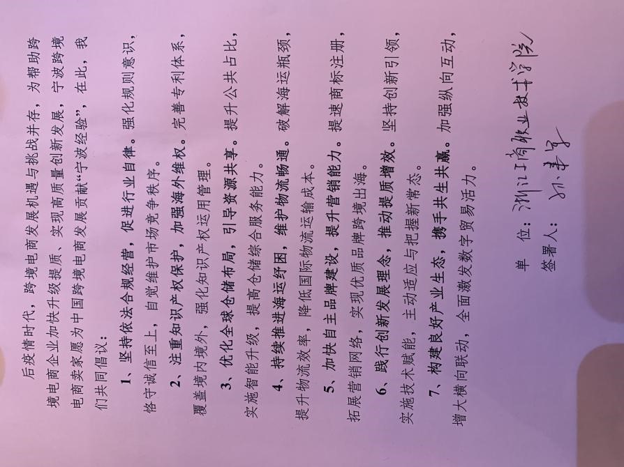 近日,跨境电商专业教师孙建军应邀参加宁波市商务局主办的首届宁波跨境TOP卖家私享会,在市商务局领导和相关处室负责人的见证下,与宁波豪雅进出口集团有限公司、邀森电子商务股份有限公司、乐歌人体工学科技股份有限公司、宁波中基天时供应链有限公司、宁波联合集团进出口股份有限公司等32家宁波大卖家代表企业和浙大宁波理工学院、浙江万里学院和宁波工程学院3所在甬高校一起,围绕跨境电商合规化经营、全球化供应链及行业高质量发展等议题开展研讨和经验分享,并为壮大宁波跨境电商行业,在全球范围内梳理跨境电商的良好信誉和形象,与会嘉宾共同向跨境电商从业者发出跨境电商“宁波倡议”。