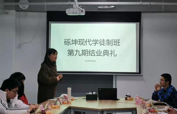 2021年1月20日下午,浙江工商职业技术学院副校长徐盈群、电子商务学院党总支书记沈弥雷、院长陈明、副院长史勤波等一行六人赴宁波砾坤进出口有限公司参加“入园办学”第九期现代学徒制班结业典礼。第九期学徒班是我校向宁波砾坤进出口有限公司定向输送的跨境电商运营人员。公司人事部经理郑乃凤女士、企业师傅代表和优秀学徒代表参加了结业仪式。