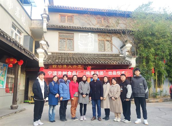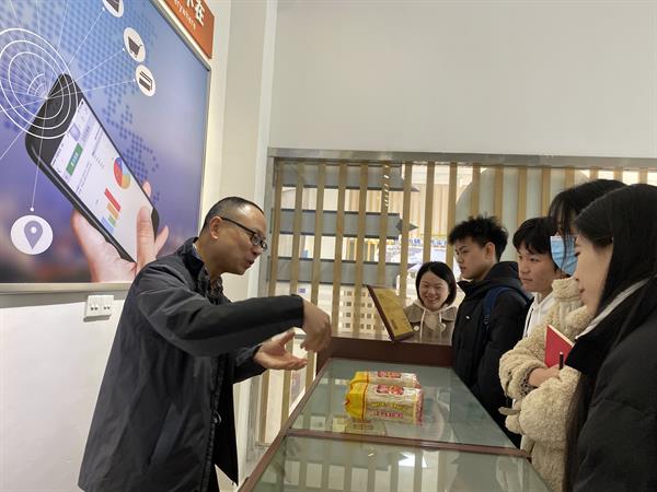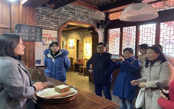 最后调研团队参观王升大博物馆。它是诞生于清光绪十五年的老字号品牌,一个非遗传承基地,博物馆原是王升大公司生产基地。一座黛瓦粉墙的仿古小楼映入眼帘,王升大创始人王兴儒和伙计在店里卖米的场景栩栩如生地展现在眼前。待刘英副馆长领着我们走进博物馆中,便开始徐徐道来王升大“升大米店,老少无欺”的来历。创始人王兴儒总是叮嘱店里的伙计,在米升中多量一角的米给百姓,因为用手拿米升时大拇指是放在米升中占据了一部分的体积,所以给老百姓盛米的时候一定要高高地耸出一角。在场的师生们听了馆长的讲解恍然大悟,纷纷称赞王兴儒先生是个诚信的商人。宁波汤圆正是在大米店经营的过程中慢慢走进百姓的生活中,逐渐被人熟知。小巧玲珑的团子带着软糯的口感,现已在各地商场的冰柜中瞧见它的身影。在王升大博物馆的三层仿古小楼里,我们还领略了百年前凤岙老街王升大米号的交易场景;见识了各种耕作、酿造器具,还获得很多知识,如稻谷是如何种植,它是如何加工成米,又是如何酿造成酒等等程序、宁波汤团又是如何传承和创新。大家实实在在地了解王升大米店的百年兴衰史。