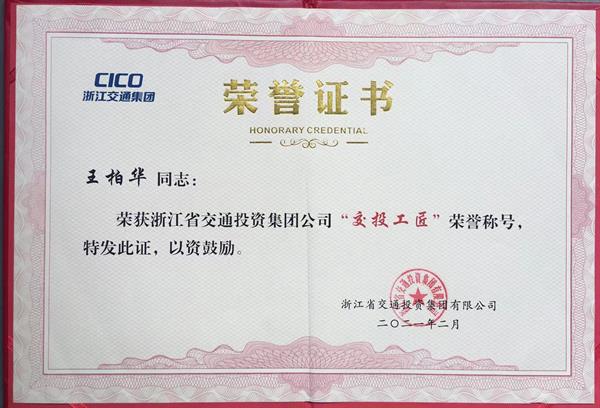 近日,浙江交通投资集团有限公司发布《关于表彰集团公司2020年“交投工匠”的通报》(浙交投〔2021〕17号),王柏华老师榜上有名。