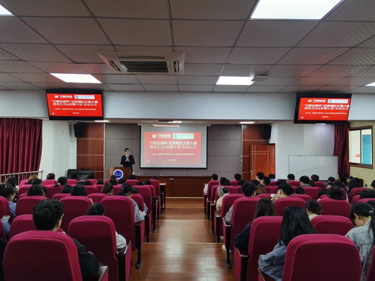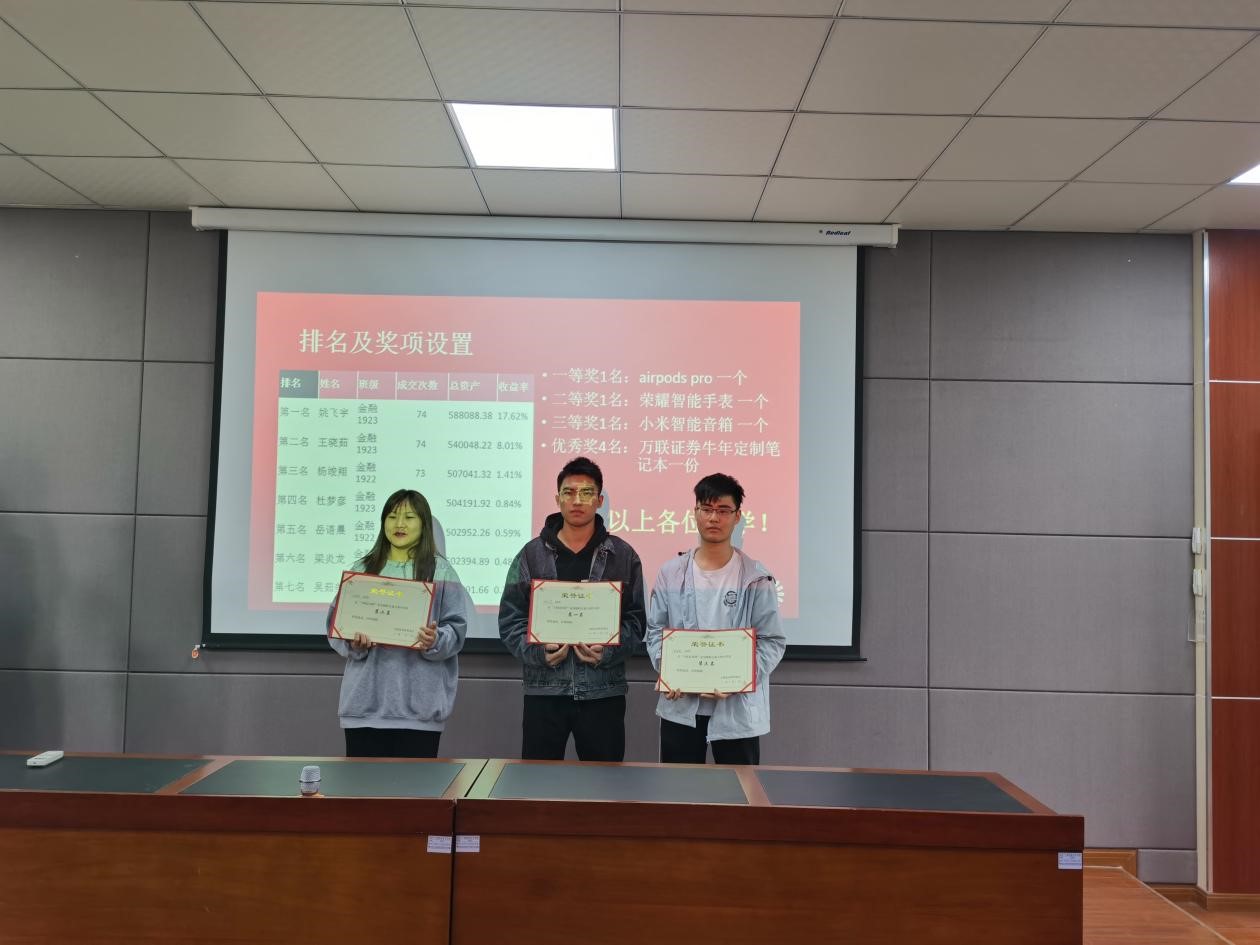 金融管理专业“万联证券杯”证券模拟交易大赛颁奖仪式暨星耀计划启动仪式隆重召开经过两个多月的艰苦奋战,2021年4月8日,金融管理专业与万联证券公司联合举办的“万联证券杯”证券模拟交易大赛圆满收官。本次竞赛中,金融1923班的姚飞宇同学勇夺第一,颁奖现场万联证券机构业务部经理应佳怡、理财经理杨渊来校亲自为学生颁发获奖证书,并提供丰厚奖品。本次竞赛,作为万联证券班《证券投资实务》课程的课前教学,竞赛指导吴成华老师结合本学期课程教学情况,对本次竞赛对课程教学的推进作用给予了充分肯定。