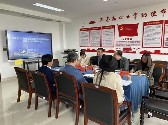 2021年4月15日下午浙江广厦建设职业技术大学国际商学院副院长徐月成、商务教研室主任杜旭雅、骨干教师许申、蒙伟伟一行四人来我校调研国际交流与合作实施概况。我院大数据与会计(中外合作办学)专业主任倪彦星一同参加调研交流。双方就国际交流与合作、中外合作项目、师生出国境交流交换等工作进行深入探讨与交流。