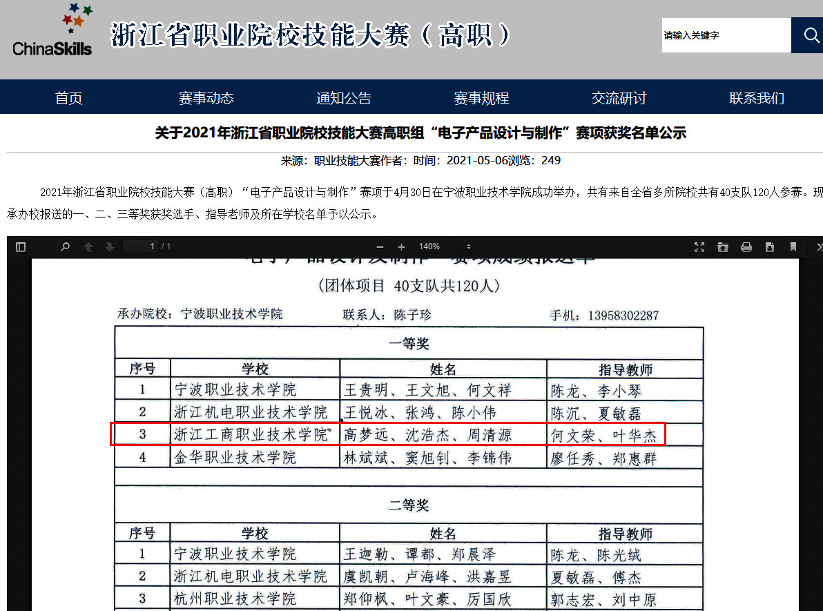 2021年浙江省职业院校技能大赛(高职)“电子产品设计与制作”赛项于4月30日在宁波职业技术学院举行,共有来自全省多所院校共有40支队120人参赛。我应用电子技术专业学生高梦远、沈浩杰、周清源团队荣获一等奖。