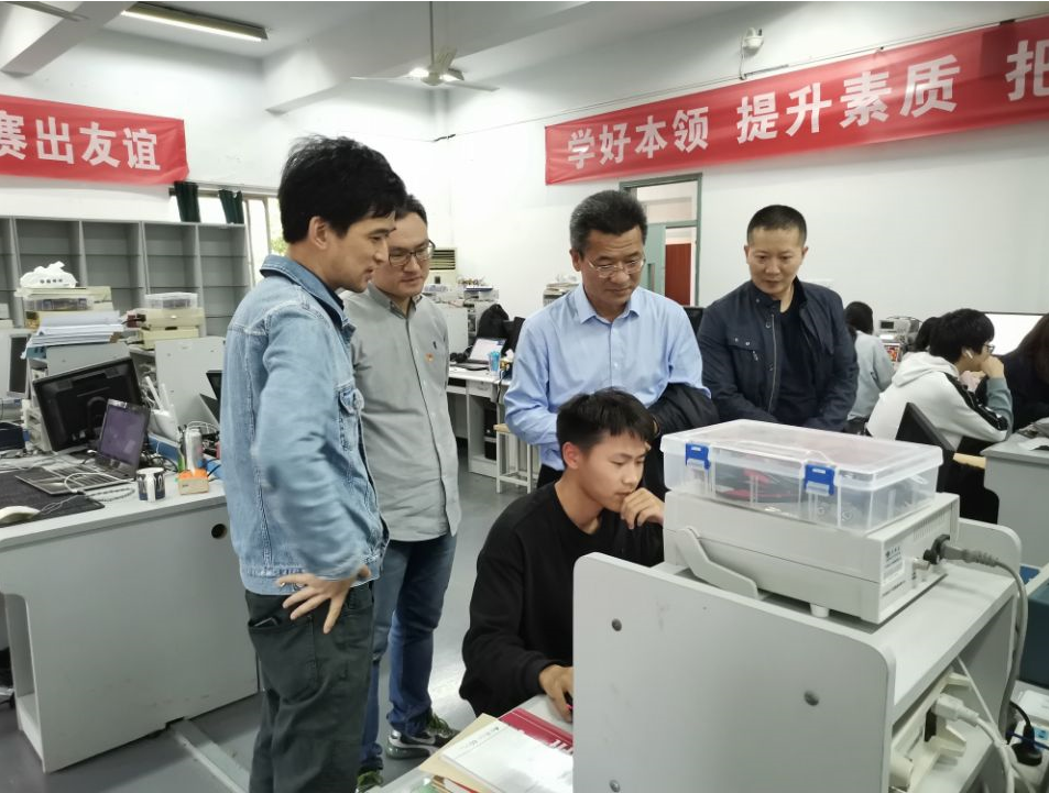 今年的高职院校技能大赛是在经历“疫情”停赛和相关改革后,首次重新在全国范围内展开。从4月16日省赛通知发出,到4月30日竞赛,不到两周的准备时间,负责竞赛的何文荣、翁正国、张培忠、陈志栋等老师,克服时间紧任务重的困难,加班加点甚至通宵熬夜,辅导学生进行PCB设计、实物焊接、程序编写,实物联调等工作。参赛的同学也都鼓足干劲,通宵达旦积极苦练,累了困了就在教室内的简易床稍作休息。训练期间,周志春校长亲临现场视察指导,并给大家鼓励加油。大家更是鼓足干劲,力争上游。