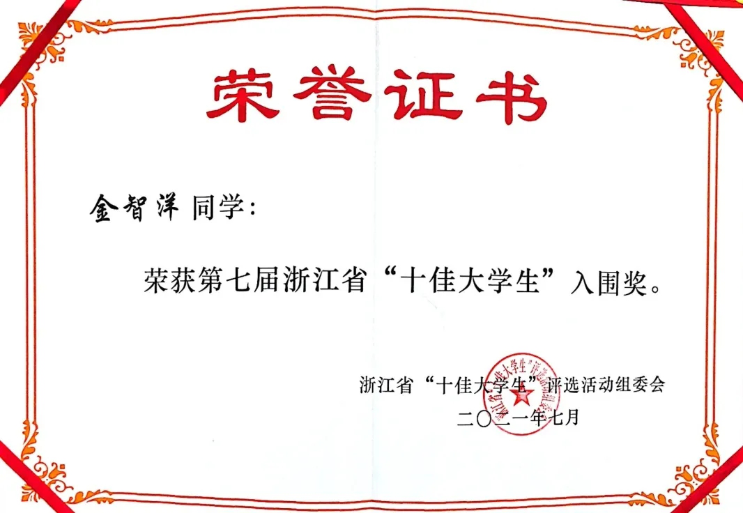 金智洋同学在校期间勤奋认真,表现优异。他学无止境,开拓创新。获国家奖学金、省政府奖学金、省优秀毕业生荣誉,积极参与各类竞赛,获浙江省“挑战杯”三等奖、校“挑战杯”特等奖等20余项荣誉。他参与产教融合大会,策划促进校企合作实践项目,组建“甬立潮头”小队,获省市级暑期社会实践优秀团队,所主持的项目获全国大学生“一带一路”社会实践项目。作为中共党员,他参与宁波市暖春行、机场综合演练、校园疫情防控等大型志愿活动30余次,累计服务280小时,获宁波市优秀志愿者、校十佳志愿者、五星志愿者等称号,展现了当代大学生的使命担当和青春风采。