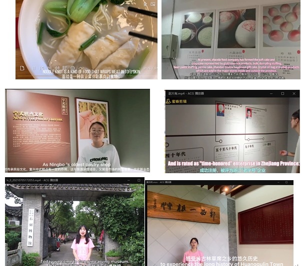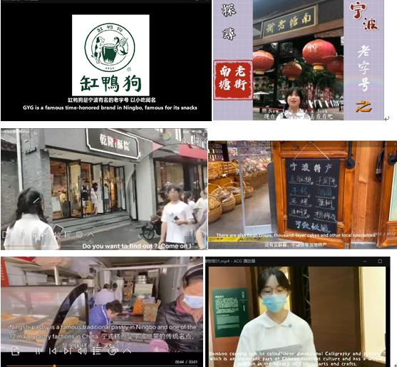 他们以班主任(都是英语专任老师哦)为指导,3-6人为一个团队,进行宁波老字号英文视频设计和制作。他们纷纷拍摄了南塘油赞子、状元楼酒店、赵大有、缸鸭狗、老字号,黄古林草席、宁波面结、矮子馅饼、宁波豆酥糖、非遗糖画、乾隆酥院、宁波博物馆、宁波石刻博物馆、韩岭等宁波人耳熟能详的品牌。