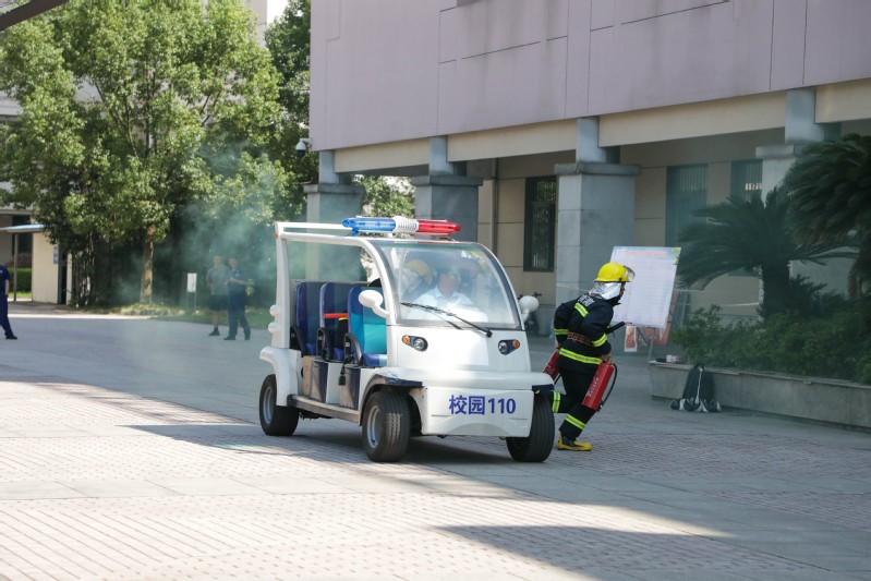 演练以校图书馆西侧阅览室因线路老化起火为背景,校消控室通过烟温传感器监测到图书馆发生火情,消控联动装置当即启动,消监控室里立即警铃大作,值班队员一边立即对讲机呼叫义务消防员,一边拿起灭火装置冲向了火场……同时,消控室一边指派校园“110”赶赴现场进行灭火救援,一边向保卫处报告火灾情况,启动了我校消防应急疏散预案,各相关小组立即按预案要求,迅速有序开展救灾工作。