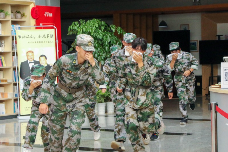与此同时,图书馆的报警装置也在循环播报:“请注意,有紧急情况,请保持镇定,有序撤离……”校卫队员首先冲进了火场利用荧光棒等物品对被困学生进行疏散,经过短暂的慌乱,参与演练的学生立即用湿毛巾、袖口等物品捂住口鼻,弯腰按照应急指示灯和队员的指引,顺着楼梯逃出了图书馆,实现了自救。
