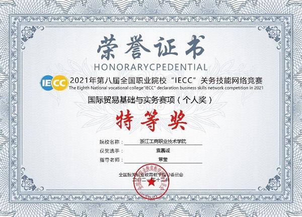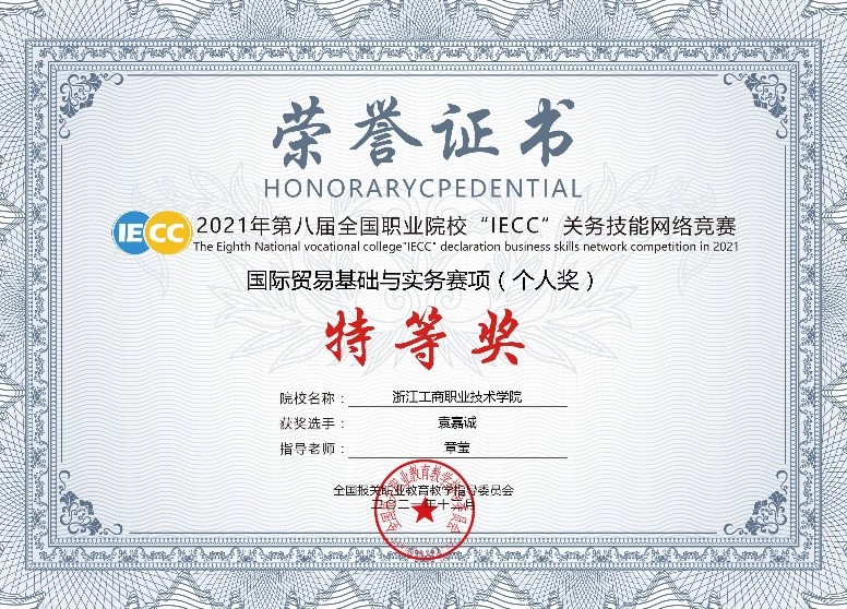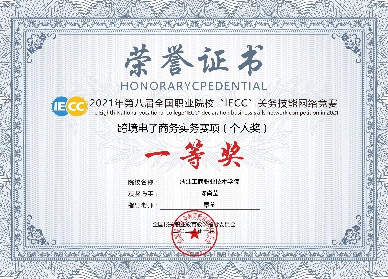 2021年12月关务与外贸服务专业学生参加第八届全国职业院校“IECC”关务技能网络竞赛。这是一项由全国报关职业教育教学指导委员会主办的全国性大赛,参赛选手来自全国各大专院校有上千人之多。我校关务与外贸服务专业的学生在此次赛事中表现优异,其中由章莹老师指导的关务2141班袁嘉诚同学夺得了国际贸易基础与实务赛项的个人特等奖。章莹老师指导的另一名学生货运1922陈肖莹获得了跨境电子商务赛事的个人一等奖。在这全国高手如云的比赛中这样的成绩实属不易,这里面有指导老师的忘我付出,也有关务专业学生们的兢兢业业。