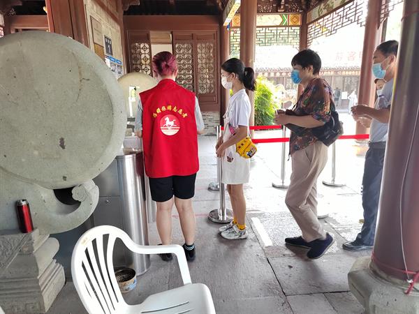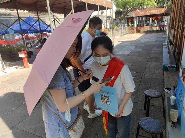 在2022年10月1日至6日,旅游管理专业2020级、2021级共计160余名学生分批次进入上述实践基地,系统承担上述基地的疫情防控宣传、秩序维护、电子设备导览、志愿讲解员、志愿研学导师等多个服务岗位的工作。在天一阁景区担任文明引导员的旅游2171班李贾玉一边熟练地指导客人线上购票,一边即时回答其他客人提出的关于天一阁景区游览的问题。在梁祝文化公园景区入口处,来自旅游2172班的万雅如全程认真核查入园游客的健康码和行程卡,并对客人提出的景区游览相关问题对答如流,受到了现场客人的高度肯定。