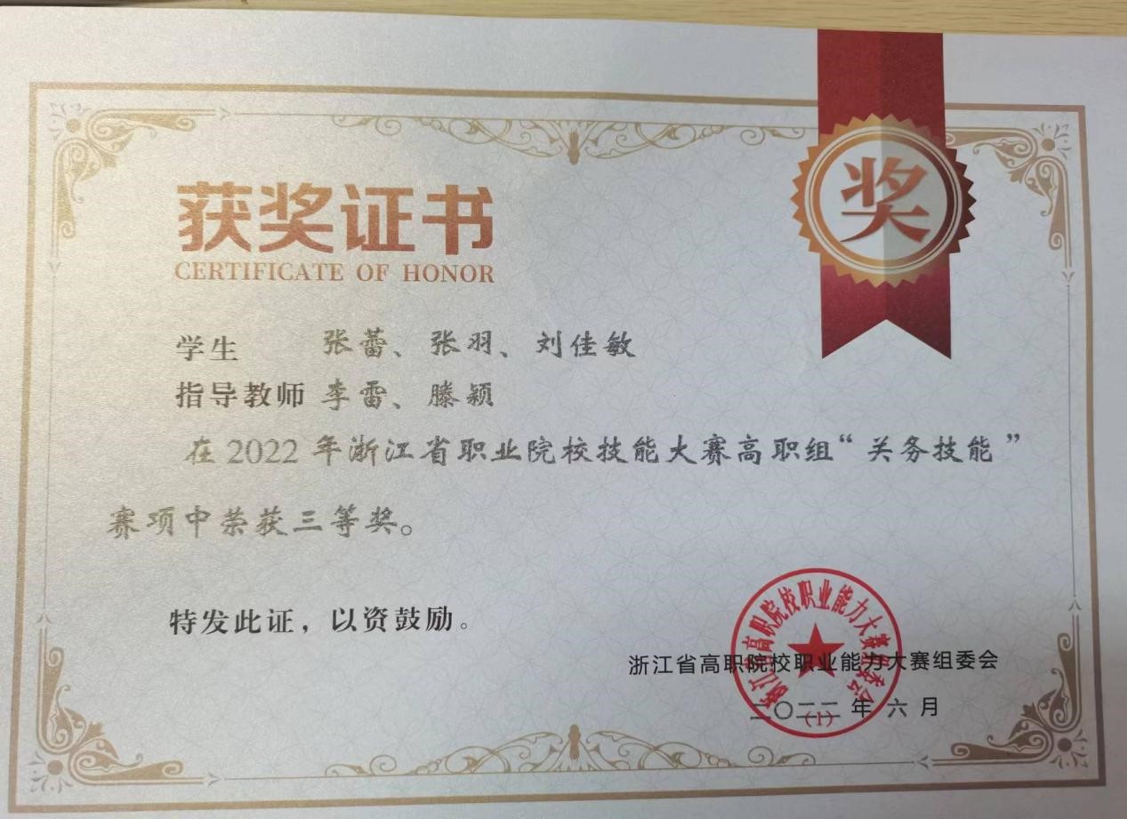 2022年5月31日,由浙江省教育厅主办的2022年浙江省职业院校技能大赛高职组“关务技能”赛项在浙江经济职业技术学院举办,共有来自全省19个院校,34支队伍参与了竞赛。由李雷、滕颖老师指导,由数字商务学院张蕾、张羽、刘佳敏同学组成的浙江工商职业技术学院1队,在经过一天四个比赛模块的激烈比拼后,最终获得了本次比赛的团体三等奖。