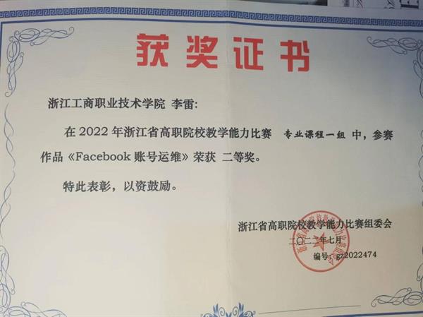 2022年7月26日至27日,2022年浙江省高职院校教学能力比赛在浙江金融职业学院圆满落幕。在本次比赛中,共有来自50所高职院校的328件作品参赛。经过初赛网评和现场决赛两个阶段的激烈角逐,关务与外贸服务专业李雷老师所在的课程团队在专业课程一组的比赛中获得二等奖。