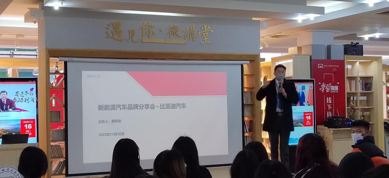 11月16日,宁波市品牌升级研究基地和我校京沪品牌升级研究中心、数字商务学院特邀宁波利鑫比亚迪4S店的展厅经理郝祥全在我校图书馆举行了“新能源汽车品牌分享会”。本次活动让师生们全面了解了比亚迪汽车公司的发展历程、新能源汽车的前沿技术和4S店的营销管理等。本次活动也是营销2141和2142班《汽车客户服务管理》、《汽车销售管理》的一次双元教学活动。师生们现场体验了比亚迪新能源汽车“海豹”的4S店“六方位说车”的技巧训练。此次活动让师生们受益匪浅,品牌升级研究基地和研究中心今后将陆续开展宣传优秀自主品牌品牌、传承品牌文化的相关活动。(供稿 张兆英)
