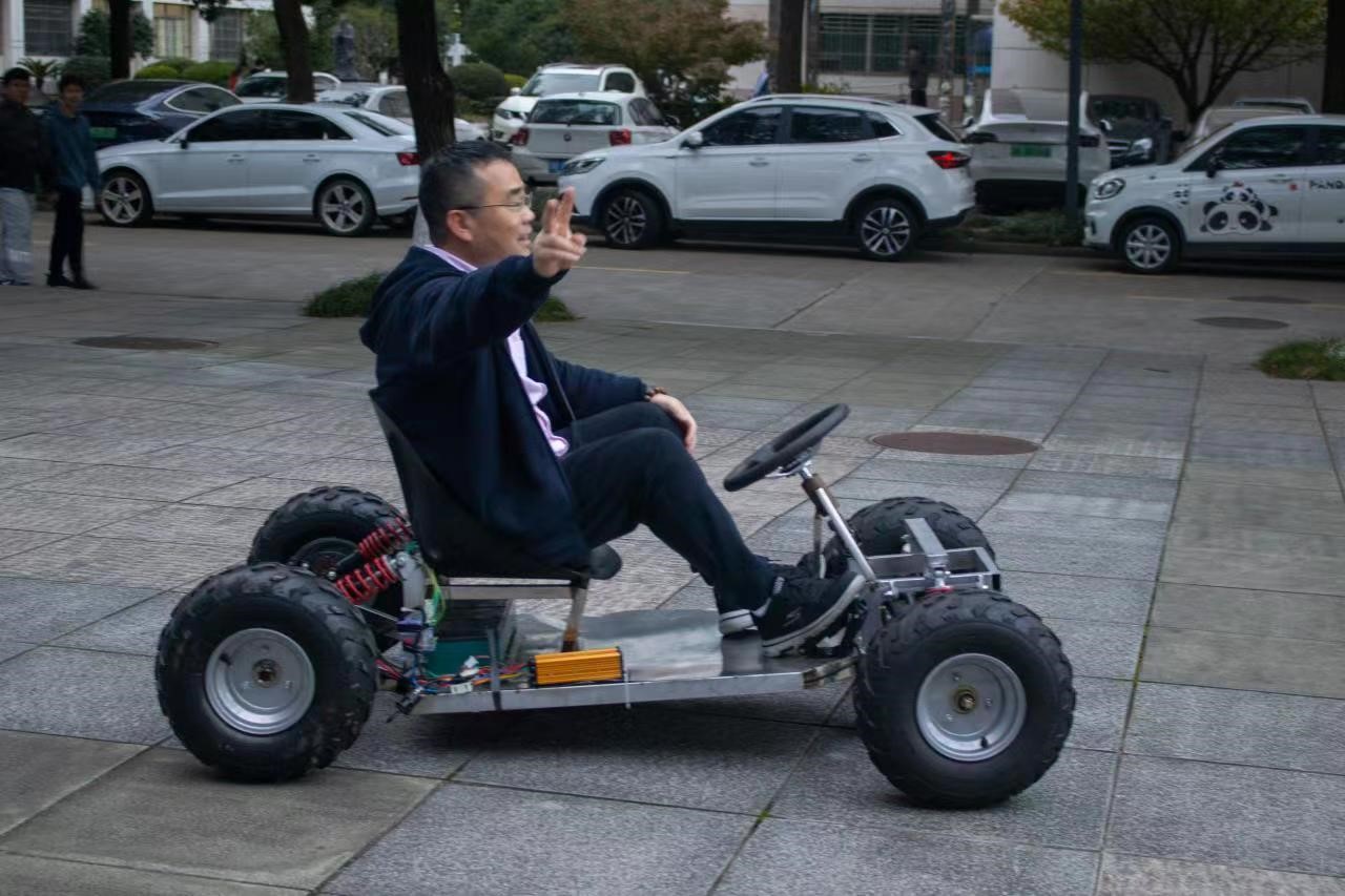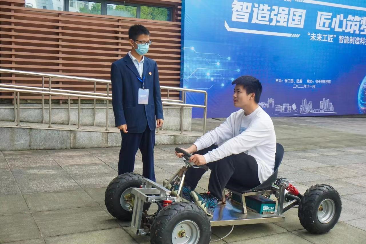 本次电子信息学院第七届“智造强国 科技筑梦”科技展最受欢迎的展品由汽修2011班储梁斌为首的同学制作的——自制小车,以其可爱的外型以及优秀的驾驶反馈,颇受一众学生教工的喜爱。小车设计简洁且操作简便,将驾驶机会作为抽奖等相关活动的一等奖,无疑大大激发了同学们的参与热情。在刹车油门的交替中、咆哮的动机轰鸣声中,笑语欢声无疑给本次会展贡献了无限的乐趣,也给大家展示了充满创新与智慧的巧手匠心。