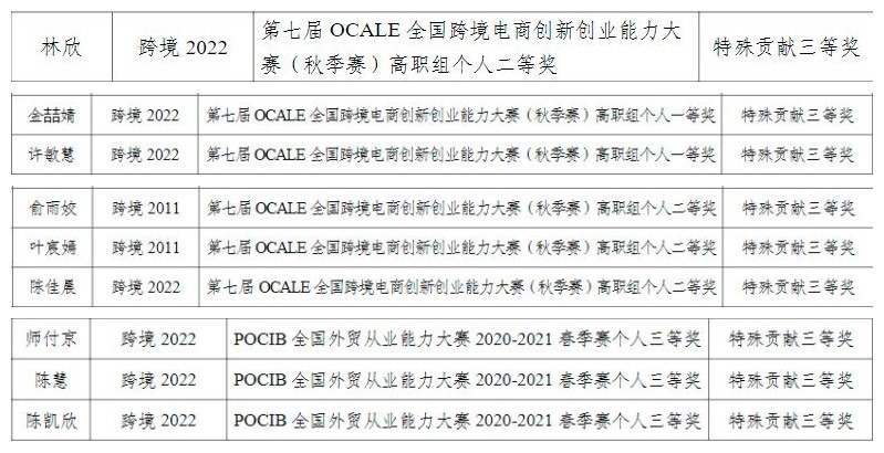 近日,跨境电商专业跨境2022班林欣、金喆婧、许慧敏、陈佳晨、师付京、陈慧、陈凯欣同学和跨境2011班俞雨姣、叶莀嫣同学分别获的校特殊贡献奖三等奖。这些学生分别在第七届OCALE全国跨境电商创新创业能力大赛(秋季赛)高职组和POCIB全国外贸从业能力大赛2020-2021春季赛中获得个人一等奖2项,二等奖4项,三等奖3项等奖。(供稿人:孙建军)