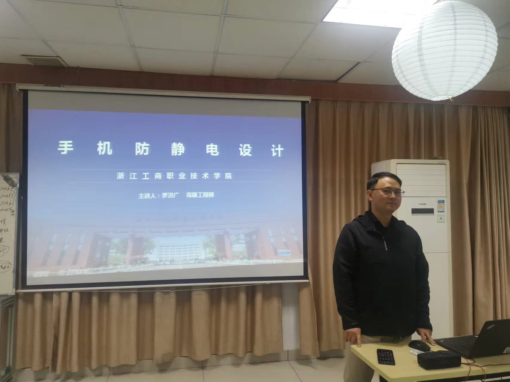 罗洪广老师为萨瑞公司取得优秀成绩表示祝贺。手机研发过程当中,防静电设计是非常重要的一个环节,罗洪广老师结合之前在企业研发的经验,为萨瑞一百多名员工进行了“手机防静电的设计”培训,受到了萨瑞员工的热情欢迎和广泛好评,并开展了热烈的讨论。培训完毕,罗洪广老师又到萨瑞公司ESD实验室,和工程师一起探讨了几个手机项目的防静电解决方案,提供一些有益的建议和指导。