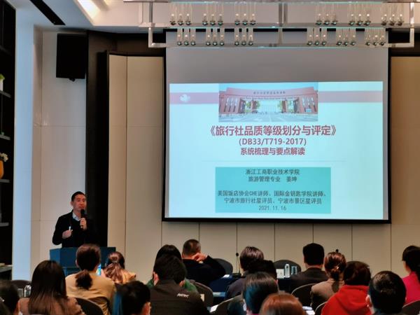为了进一步推进宁波市旅行社行业品牌化建设何转型升级,进一步提升旅游服务品质,宁波市旅行社品质评定委员会组织了2021年度旅行社品质评定培训会。我校旅游管理专业专任姜坤老师应邀给全体参会旅行社企业、各个区县旅游局行管部门负责人做了一场专题培训。