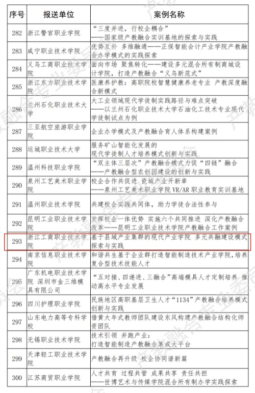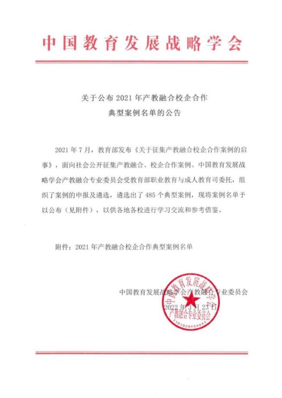 2022年3月23日,中国教育发展战略学会产教融合专业委员会受教育部职业教育与成人司委托,发布了《关于公布2021年产教融合校企合作典型案例名单的公告》,我校由科研与社会服务处牵头申报的案例《基于县域产业集群的现代产业学院 多元共融建设模式探索与实践》成功入选产教融合校企合作典型案例。