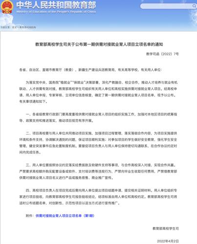 就业是国民经济的“晴雨表”,是社会稳定的“压舱石”,事关共同富裕、经济社会发展大局。当前疫情多发,大学生就业压力较大,教育部供需对接就业育人项目是落实党中央、国务院“稳就业”“保就业”决策部署等对大学生就业工作指导意见的伟大实践,更是落实《教育部2022年工作要点》“推动就业与招生培养联动改革,实施供需对接就业育人项目”的重要举措。