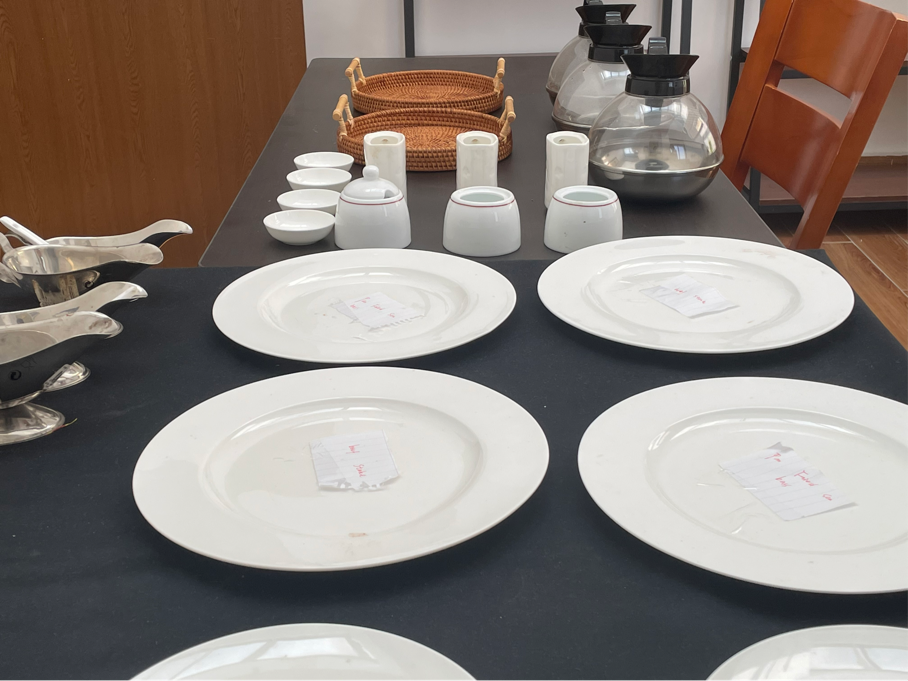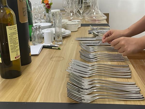 此次比赛将采取“中西合作”的方式,两位同学结为一队,我校派出了两支队伍参赛。 备赛期间,负责此次比赛指导老师们忙得不可开交,争取为选手们提供更多的指导与帮助。这两个多月的时间里,她们忙着备课的同时也为选手们提供更佳的建议,辛苦程度十分之高。 定位、摆放、服务……这是她们比赛的任务。形状不一但却有序的高脚杯,摆放整齐的碗碟筷架,一张张叠放整齐且美观的口布以及洋溢着微笑热情的服务,无一不体现着她们对比赛的态度与能力。