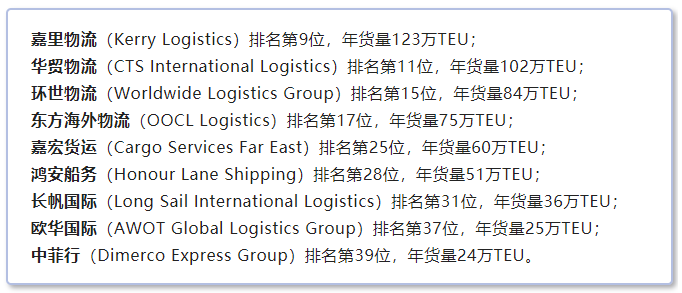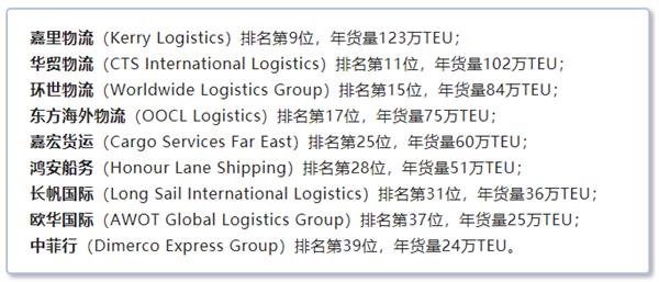 日前,物流业权威杂志《Transport Topics》公布了2022全球海运、空运货代50强榜单。与上年相比,2022全球海运货代前5位的排名没有变化,依次为:德迅(Kuehne+Nagel)排名第一,年货量461.3万TEU;中国外运(Sinotrans)排名第二,年货量375万TEU;DHL排名第三,年货量314.2万TEU;DSV排名第四,年货量290万TEU;德铁信可(DB Schenker)排名第五,年货量221.5万TEU。除中国外运外,还有9家中国企业上榜,包括: