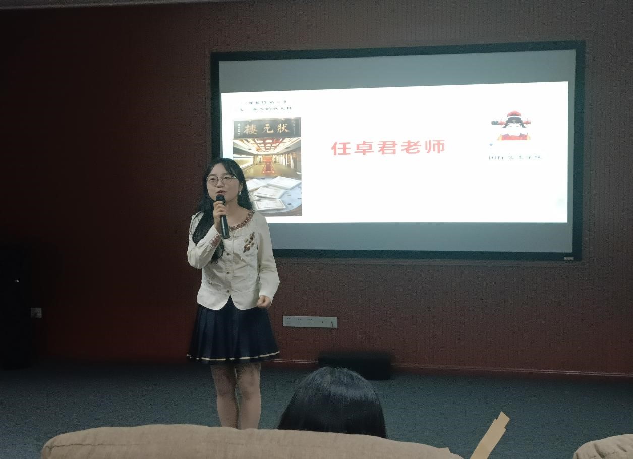 优秀作品的师生代表分享时,在场听众深深为中华文化所折服。一等级获得者任卓君老师围绕“状元楼”这个品牌,分别通过两条主线展开作品。一是自己由“垂髫小儿”成长为一名光荣的人民老师,二是以状元楼作为建筑的来源和发展历史。文章通过两条成长线,既展示了“状元楼”的品牌传承、成长与创新,也表达了“我”对状元楼、对家乡的眷恋之情。故事的背后是浓浓的乡情、亲情和深厚的师生情谊。任老师的表述,文笔细腻,感情深厚。她还以自身的创经历鼓励同学们要坚持写作。二等奖获得者徐梵怡同学,通过她在故宫的亲身体验和细腻笔触,把故宫文创栩栩如生地展现在听众眼前,给人强烈的“种草”感受。故宫通过老瓶装新酒的方式,正在传承与创新着中华文化,让一系列故宫文创受到大众热捧,也向世界人民展示了中国文化的自信。