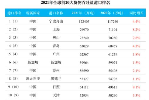 上海国际航运研究中心最新发布的《全球港口发展报告(2021)》显示,2021年全球前20大货物吞吐量港口排名中,中国占据8席。其中,宁波舟山港排名第一,上海港位居第二,唐山港位居第三,青岛港和广州港分别位居第四和第五。苏州港、日照港、天津港分别位居第七、第九和第十位。